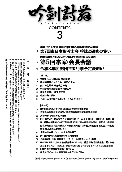 月刊 吟剣詩舞は、吟剣詩舞道界の各流、各会を通じ、最も親しまれている雑誌です。毎号、吟詠の発声、剣詩舞の振付、漢詩添削などの教養講座のほか、吟剣詩舞道界の全国的な大会や行事、コンクールなどの様子を的確に伝え、また、テレビ・ラジオ放送のスケジュールを掲載して、吟剣詩舞愛好家の勉強並びに交流の情報源となっています。