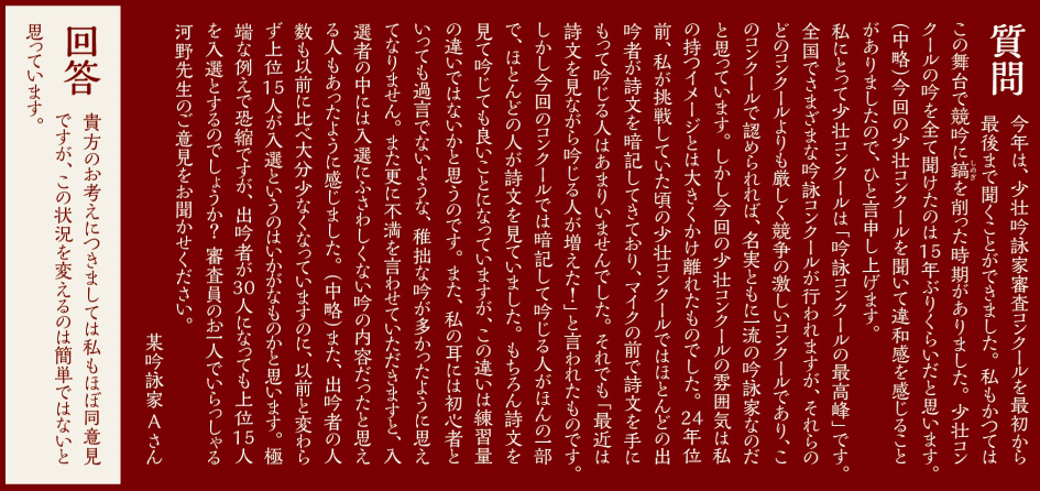今回は、ご質問というより、少壮コンクールに対する苦言として受け止めなくてはならない内容と思いますし、ましてや吟詠音楽に直接関わるお話とも思えませんが、審査員の一人として何らかのご返答をしなくてはならないと思います。