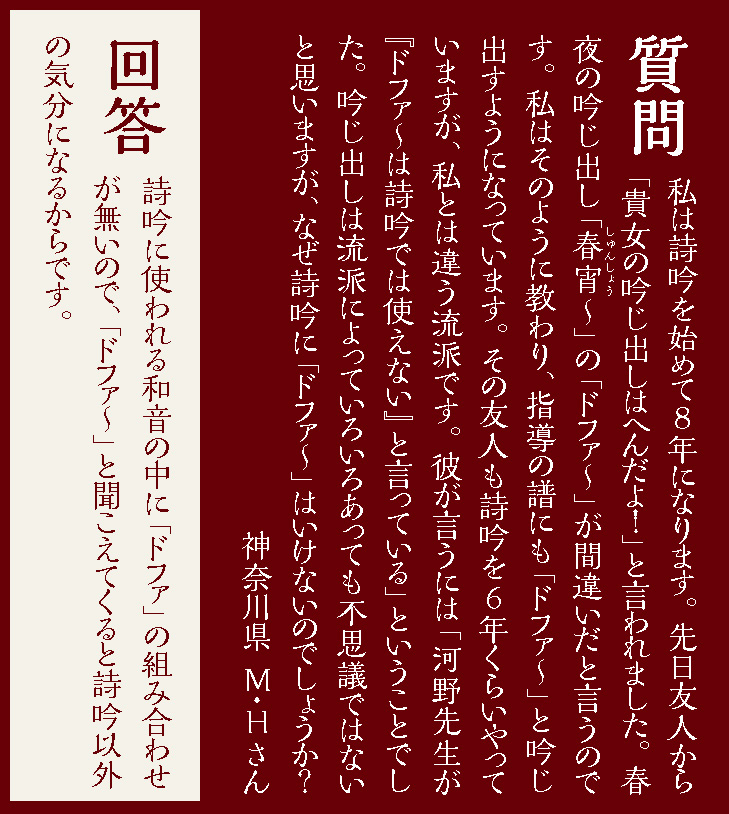 「ドファ~」の吟じ出しが習慣になるとたいへんなことになってしまいます。今から急いで「レファ~」と「ミファ~」の吟じ出しを練習しましょう。「ドミ~」もネ。よほど特殊な場合でないと「ドファ~」の吟じ出しはあり得ません。流派の問題では有りません。