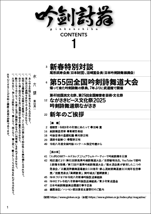月刊 吟剣詩舞は、吟剣詩舞道界の各流、各会を通じ、最も親しまれている雑誌です。毎号、吟詠の発声、剣詩舞の振付、漢詩添削などの教養講座のほか、吟剣詩舞道界の全国的な大会や行事、コンクールなどの様子を的確に伝え、また、テレビ・ラジオ放送のスケジュールを掲載して、吟剣詩舞愛好家の勉強並びに交流の情報源となっています。
