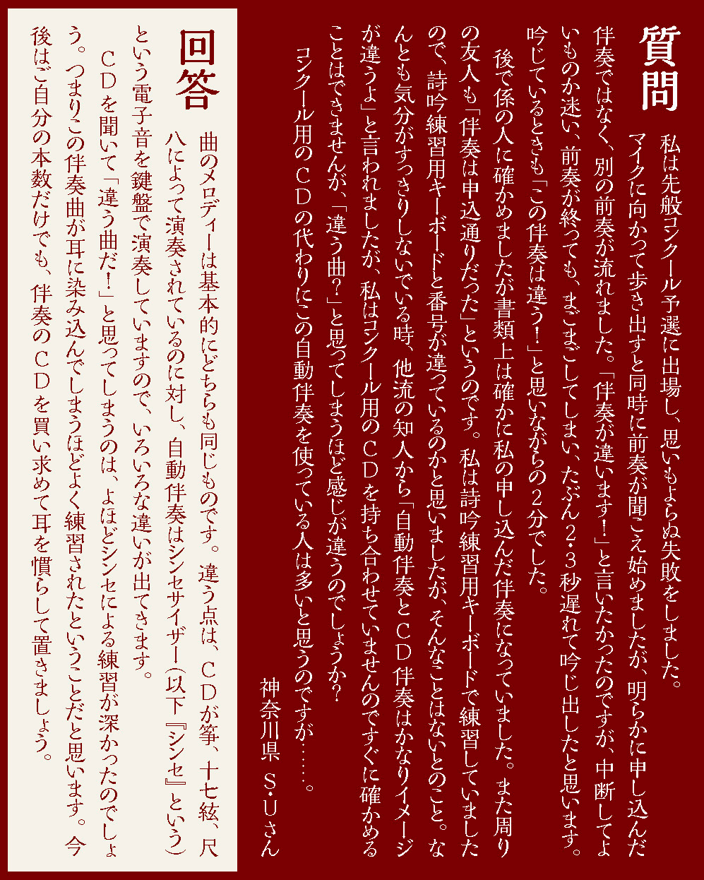 結論的なことを申し上げますと、やはりCD伴奏をよく聞いて耳を慣らしておくことが大切です。財団主催のコンクール決勝はCD伴奏によるものですから必ず聞く必要があります。3本以下の方は特に注意してください。また「続伴奏集」もありますので、両方ともご自分の本数だけはお買い求めになった方が宜しいと思います。伴奏に関しては全て指導者にまかせっきりの方が多いと思いますが、コンダクターや詩吟練習用キーボードを使える人と使えない人では詩吟に関する見識もずいぶん違うと思います。