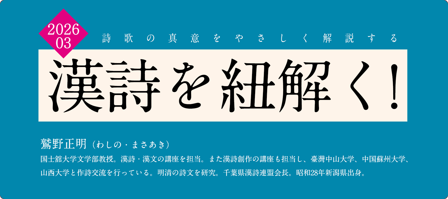 2025年10月号で取り上げた佐野竹之助も水戸藩士で、その「出郷の作」は死を覚悟して郷里を出る作品でした。吉田松陰の「辞世」(2025年11月号)とともにあらためて読んでみると、志士の心映えが見えてきます。