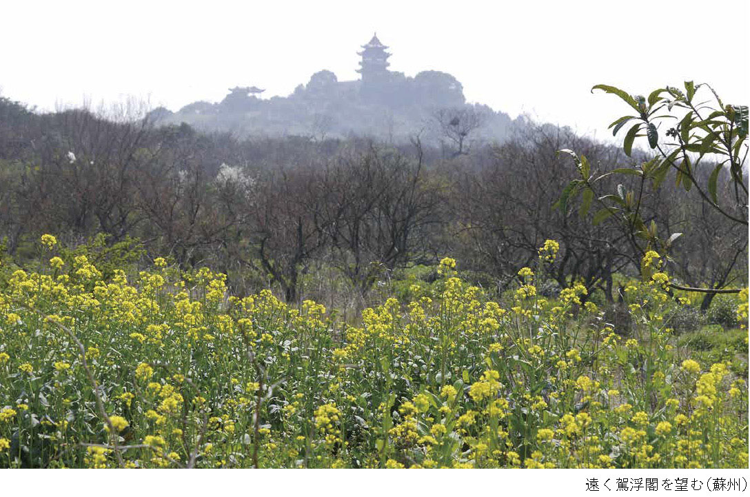 「水を渡り」「花を看る」を重ねて繰り返す表現から、川沿いの路を足の向くまま気の向くまま、寄り道をしながら歩いているようすがうかがえます。高啓は水の都として知られる蘇州の人です。むかし蘇州城内は水路と陸路が縦横に走っていました。城内の移動には舟を利用することもありました。郊外に出れば広々とした平野に大小の川が流れ、湖や沼があり、春の日ざしに輝いていたことでしょう。春の先駆けには梅の花、やがて桃の花や海棠の花が咲き、杏子、梨、菜の花などが咲きます。花のまわりには蝶が舞い蜂も飛んでいます。高い木の上にはカササギが大きな巣を作り、あちらこちらから鳥の美しい鳴き声が聞こえてきます。詩の前半はわずか十文字ですが、繰り返しの素朴な表現から、江南の春の美しい風景が浮かんできます。